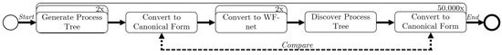 Here, we briefly discuss the experimental setup of our experiments. Consider Figure 13, in which we present a graphical overview. Using an implementation of PTandLogGenerator [18,19], we generate process trees, using two triangular distributions for the number of activities, i.e., and . The process trees are translated to WF-nets, using two different translations. One translation creates invisible start and end transitions for each operator; the other translation only does so when required (similar to Figure 5). The first translation generates larger nets in terms of transitions/places/arcs. In general, the sizes of the respective WF-nets generated differs significantly.For each triangular distribution/translation combination, we generate process trees (yielding experiments). Finally, we compare the generated process tree in canonical form [20] [Section 5.1], to the resulting process tree in canonical form.