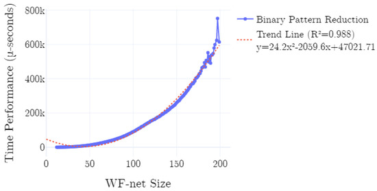 Here, we briefly discuss the results of the conducted experiments. Consider Figure 14, in which we present the average time performance of the implementation on the data as generated according to the described experimental setup. We plot the time performance, conditional to the size of the input WF-net. Additionally, we plot a polynomial trend-line, computed using polynomial least squares. As is clearly observable in Figure 14, the time performance is quadratic in the size of the net (). This is confirmed by the -score of the trend-line, i.e., ∼0.988. Note that, the fluctuations in the right-hand-side of the chart are explained by a relative smaller amount of experiments conducted with models of the corresponding sizes. In all experiments, the canonical form of the generated process tree equals the canonical form of the (re)discovered process tree.