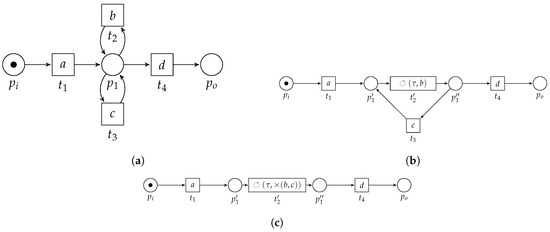 Consider Figure 16, in which we depict a simple example of the application of the self-loop reduction as described. The transitions and in the WF-net depicted in Figure 16a are self-loops on place . In Figure 16b, the reduction is applied only on . Note that, in this model, a loop reduction can be applied yielding . Note that first reducing is symmetrical, i.e., eventually yielding . Note that both process trees, indeed, describe the language (i.e., when described as a regular expression). In Figure 16c, we show the application of the self-loop reduction when it is applied directly using . In this case, the reduction yields a new transition with label . Again, the language described by the process tree discovered can be described by . Finally, let X denote any of the three process tree fragments discoverable in the example describing . Observe that the reduction algorithm discovers (or any binary form thereof), which corresponds to the regular expression , which is indeed the language of the WF-net depicted in Figure 16a.
