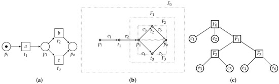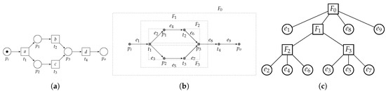 The edges and , visualized as and are part of the root fragment, i.e., , which is the complete edge set of the WF-net/workflow graph. The choice construct, i.e., connecting place and to transitions and , respectively, comprises fragment , which is further subdivided into fragments and . Note that the process tree corresponding to is , i.e., consisting of 5 vertices. Hence, to translate the RPST to the corresponding process tree, we need to “collapse” and into b and c, respectively. Similarly, needs to be transformed to × and, needs to be transformed to →. Finally, and need to be merged into a.