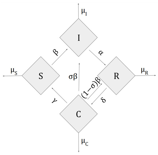 Schematic representation of the Susceptible–Infectious–Recovered–Cross-immune (SIRC) model.