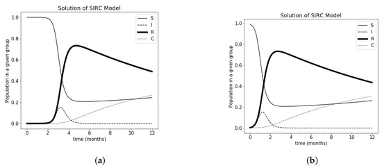 Solutions for SIRC models without optimal control: (a) at the beginning of the epidemic (b) when the epidemic is developed.