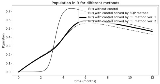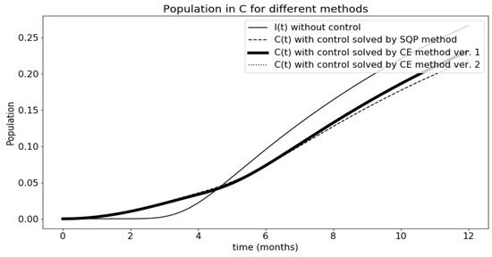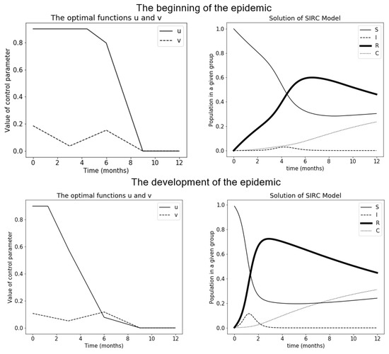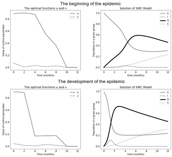 In Section 3.3 and Section 3.4 two ways of calculating optimal functions and for the SIRC model will be considered. In the first version, the functions will be calculated separately. In the following, both and will be counted at the same time. All versions will be presented at two moments of the epidemic: when it began and when it has already spread. The results will be compared with those obtained in the article by Iacoviello et al. [31], where the problem was solved using the sequential quadratic programming method using a tool from Matlab. Unfortunately, the article does not specify the cost index value for solving the obtained sequential quadratic programming method. Therefore, in the paper, there were attempts to recreate the form of the function and and the cost index obtained for them ( for the first situation and for the second one) and the model solution.