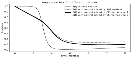 An approach to optimize this model was proposed by Iacoviello and Stasio [31]. In this article one can find the suggestion concerning performing the calculations as outlined by Zaman et al. [32]. Two functions were proposed in the approach as the parameter or controls. One relates to the susceptible people and the other describes the number of sick people. The method described by Kamien and Schwartz [33] was used to determine the optimal solution. In order to apply it, the set of Equation (1) should be updated accordingly. After these modifications, it has the following form: