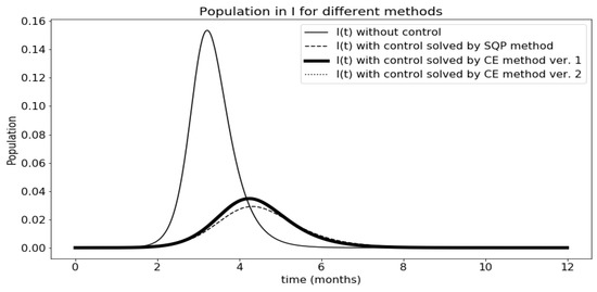 Now when is represented as a parameterized function, the value can be counted by solving the system of ordinary differential Equation (3) e.g., by the Runge–Kutta method. The idea of using the CE method in this problem is to use a multi-level algorithm with generated checkpoints , here, from a normal distribution. The CE method does not impose the distribution. Usually it is chosen from the family of density which is expected. Here, it is expected that there will be one high peak at the peak of the epidemic. Hence the normal distribution. Then, update the distribution parameters using the CE procedure using the target indicator as a condition for selecting the best samples. The calculations are carried out until the empirical variance of optimal control function is smaller than the given . This means that the function values are close to the optimal expected value The idea of applying the CE method to the SIRC model is similar. The only difficulty is the fact that when optimizing the SIRC model there are two functions instead of one as in the case of the algorithm described here. In the form of an Algorithm 1, it looks as follows: