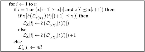 The input strings for the algorithm are $-terminated strings over an integer alphabet. The reduction computed in (1) is important. All linear algorithms for suffix array computations use the proximity property of suffixes: comparing and can be done by comparing and and, if they are the same, comparing with . For instance, in the first linear algorithm for the suffix array by Kärkkäinen and Sanders [37], obtaining the sorted suffixes for positions and via the recursive call is sufficient to determine the order of suffixes for the positions, then merging both lists together. However, there is no such proximity property for right-maximal Lyndon substrings, so the reduction itself must have a property that helps determine some of the values of the Lyndon array of from the Lyndon array of and computing the rest.