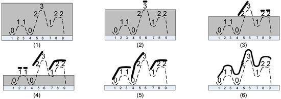 Every position of the input string that occurs in some -pair as the first element is labelled black; all others are labelled white. Note that Position 1 is always black, while the last position n can be either black or white; however, the positions and n cannot be simultaneously both black. Note also that most of the -pairs do not overlap; if two -pairs overlap, they overlap in a position i such that and and . The first position and the last position never figure in an overlap of -pairs. Moreover, a -pair can be involved in at most one overlap; for an illustration, see Figure 2; for the formal proof see Lemma 2.