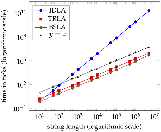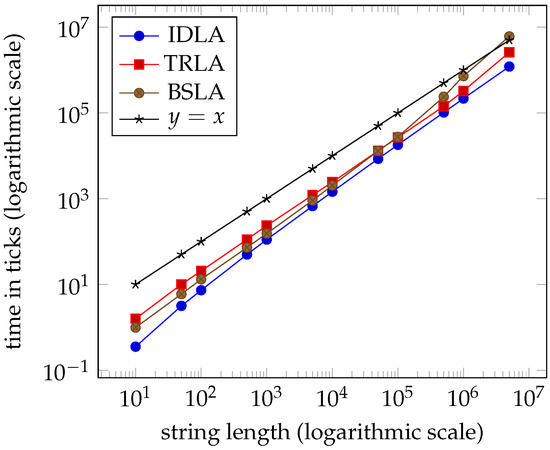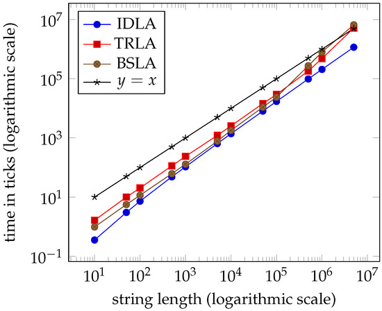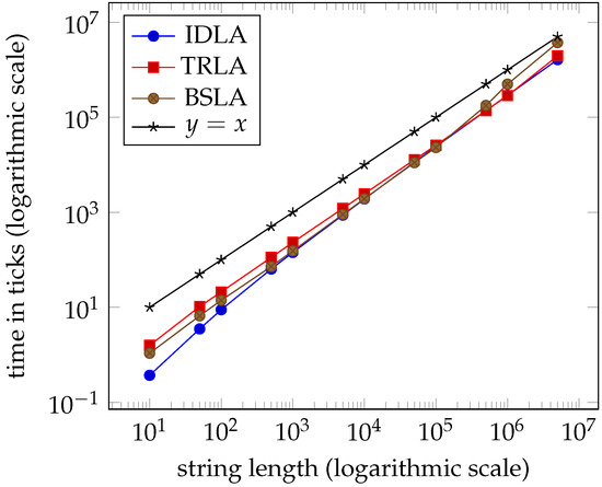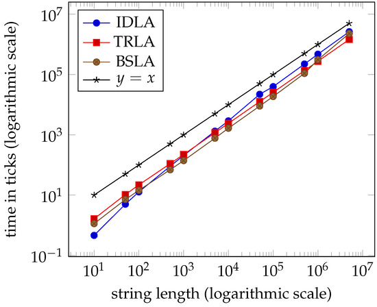 Initially, computations were performed on the Department of Computing and Software’s moore server; memory: 32 GB (DDR4 @ 2400 MHz), CPU: 8 × Intel Xeon E5-2687W v4 @ 3.00 GHz, OS: Linux Version 2.6.18-419.el5 (gcc Version 4.1.2 and Red Hat Version 4.1.2-55). To verify correctness, new randomized data were produced and computed independently on the University of Toronto Mississauga’s octolab cluster; memory: 8 × 32 GB (DDR4 @ 3200 MHz), CPU: 8 × AMD Ryzen Threadripper 1920X (12-Core) @ 4.00 GHz, OS: Ubuntu 16.04.6 LTS (gcc Version 5.4.0). The results of both were extremely similar, and those reported herein are those generated using the moore server. All the programs were compiled without any additional level of optimization (i.e., neither -O1, nor -O2, nor -O3 flags were specified for the compilation). The CPU time was measured in clock ticks with 1,000,000 clock ticks per second. Since the execution time was negligible for short strings, the processing of the same string was repeated several times (the repeat factor varied from , for strings of length 10, to one, for strings of length ), resulting in a higher precision. Thus, for graphing, the logarithmic scale was used for both, x-axis representing the length of the strings and y-axis representing the time. We used four categories of randomly generated datasets: