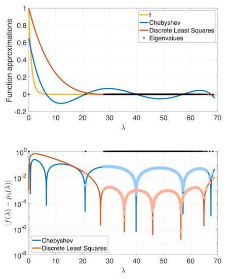 While the classical truncated orthogonal polynomial expansion methods (e.g., Chebyshev, Legendre, Jacobi) aim to approximate the function f throughout the full interval , it is only the polynomial approximation error at the eigenvalues of that affects the overall error in (3). With knowledge of the complete set of eigenvalues, we could do better, for example, by fitting a degree K polynomial via the discrete least squares problem . In Figure 1, we show an example of such a discrete least squares fitting. The resulting approximation error for is 0.020, as opposed to 0.347 for the degree 5 truncated Chebyshev approximation. This is despite the fact that is equal to 0.650 for the discrete least squares approximation, as opposed to 0.347 for the Chebyshev approximation.