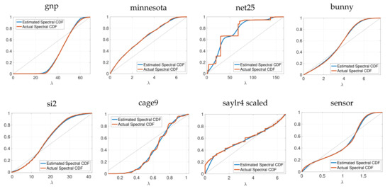 Estimated and actual cumulative spectral density functions for eight real, symmetric matrices A. We estimate the eigenvalue counts for linearly spaced points on via (6), with degree polynomials and random vectors .
