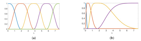 In the field of graph signal processing [4], it is common to analyze or modify a graph signal , where is the value of the graph signal at vertex i of a weighted, connected graph G with N vertices, by applying a graph spectral filter . The filtered signal is exactly the product (1) of a function of the graph Laplacian (or some other symmetric matrix) and a vector, the graph signal . In Figure 6, we show examples of collections of such functions, commonly referred to as graph spectral filter banks. In the right three columns of Figure 5, we examine the relative errors incurred by approximating for the lowpass, bandpass, and highpass graph spectral filters , , and shown in Figure 6a. We expand on the applications of such graph spectral filters in Section 5.