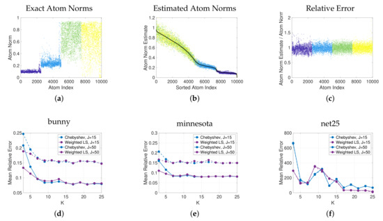 Estimation of the norms of the atoms of spectral graph wavelet dictionaries. (a) Exact atom norms, , colored by the indices of the generating filters (shown in Figure 6), each of which is localized to every vertex on the bunny graph. (b) Comparison of the estimated norms, , to the corresponding exact norms (shown in black). The atoms are sorted in descending order of exact norm to aid visual comparison. (c) The ratios of the estimated norms to the exact atom norms. (d–f) The mean relative errors across all atoms for dictionaries generated by the same set of filters on three different graphs, with varying polynomial approximation methods, polynomial degrees K, and numbers of random vectors J.