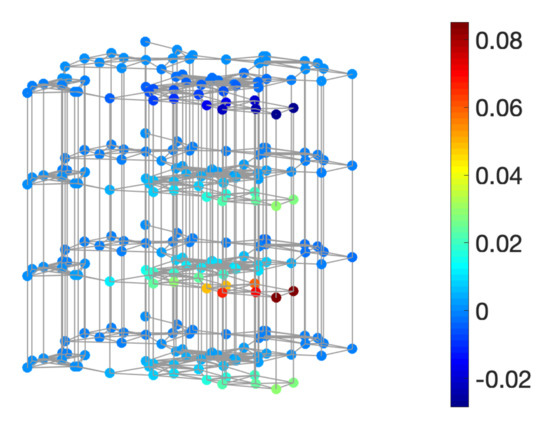 We consider a weighted, undirected graph with N vertices, where is the set of vertices, is the set of edges, and is the weighted adjacency matrix. The combinatorial graph Laplacian is defined as , where is diagonal with equal to the degree of the ith vertex. At each vertex, we observe a time series of T observations. Thus, the time-varying graph signal can be represented as a matrix , where is the value on the ith vertex at the jth time. Figure 8 shows an example of a time-vertex signal.
