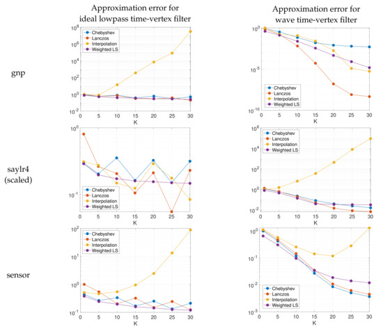 We consider the ideal lowpass filter (12) and the wave filter (13). We approximate for both filter functions, with observations, and for different graphs G: gnp (), saylr4 () and a random sensor network (), the cumulative spectral densities of which are shown in Figure 2. In each case, we choose , i.e., a constant vector in the joint spectral domain of and , in order to test the average performance of the approximation methods over different combinations of eigenvalue pairs. With polynomial approximation orders ranging from to 30, we follow the procedure described in Algorithm 3 to approximate . We estimate the cumulative spectral density functions with parameters , , and . We use in the spectrum-adapted polynomial regression/orthogonal polynomial expansion when finding the best polynomial approximation. We compare the proposed methods to the truncated Chebyshev expansion and the Lanczos method with the same polynomial order. For each method, we examine the convergence of relative errors in Frobenius norm as a function of K for graphs with various structures (and thus various distributions of Laplacian eigenvalues). The results are summarized in Figure 10. Similar to our observation in Figure 5, we see that the spectrum-adapted interpolation method performs well for lower polynomial orders , but tends to be unstable at higher polynomial orders.