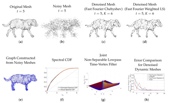 We perform a grid search to find the values of the parameters and that minimize the relative error averaged over multiple realizations of the noise. In Figure 11g, we show the resulting filter with and on the joint spectrum of the graph shown in Figure 11e. The dashed black line in Figure 11h shows the relative error between the denoised sequence computed exactly in (15) and the original dynamic 3D mesh sequence, averaged over 20 realizations of the additive Gaussian noise. The other three curves in the same image show the average relative error when the computation in (15) is approximated by the fast Fourier Chebyshev method of [50], the Chebyshev2D method of [64], and the spectrum-adapted approximate time-vertex filtering (fast Fourier weighted least squares) of Algorithm 3, for different values of the polynomial degree K. All three approximations converge to the exact solution and corresponding error, but at low degrees (), the spectrum-adapted fast Fourier weighted least squares yields a better approximation. Figure 11c–d display examples of the denoised mesh at a single time () resulting from two of these approximations, with . The difference between the two is subtle, but can be seen, e.g., by scanning the top of the dog, where the mesh points form a slightly smoother surface.