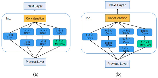Module before and after the replacement. (a) Inception module diagram of I3D; (b) Convolution kernel replacement.