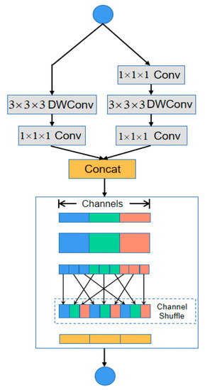 The residual block is introduced through point-by-point grouping convolution and channel mixing operations. As shown in Figure 4, after point-by-point grouping convolution, the shuffle operation is performed to improve information flow between different groups on the bottleneck feature of the main branch. Then a smaller 3 × 3 × 3 and 1 × 1 × 1 depth separable convolution is used to reduce the amount of calculation, after a point-by-point grouping convolution, the two branch pixels are added. An average pooling operation is added to the branching for replacing the pixel-by-pixel addition operation which can expand the channel dimension with a small amount of computation.