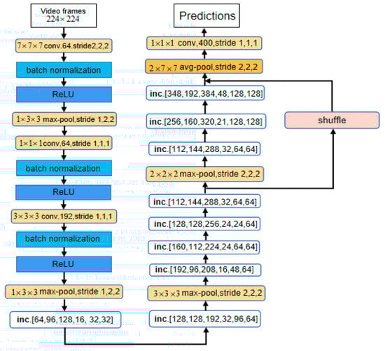 For the I3D-shufflenet, a two-dimensional convolution is extended to a three-dimensional shufflenet after adding time information. The feature information of the image is fused through different convolution processing of inception, and the output layer of inception is used as the input of channel fusion, in which half of the feature maps are directly entered into the next module. The shuffle operation is added after the 6th layer inception structure in the I3D network, and the shuffle is fused with the image information processed by the 9th layer inception. This can be seen as a feature reuse which is similar to DenseNet and CondenseNet. The other half is divided into three channels by channel segmentation and processed separately. The structure of I3D-shufflenet is shown in Figure 5.