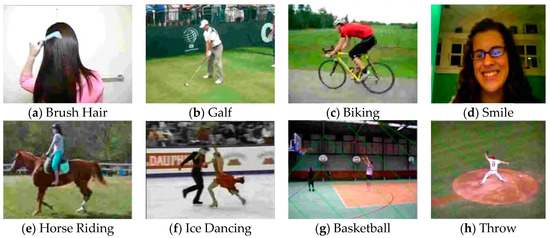 This experiment mainly used the UCF101 data set [18] which is currently the most mainstream data set for human action recognition. The resolution of the UCF101 data set was 320 × 240, and there were 101 types of actions. Each type of action was composed of about six videos taken by 25 people. The 101 human behaviors in the UCF101 data set (total 27 h) were divided into 13320 images with two groups (the training samples and the testing samples) by a ratio of 3:1. Part of the action samples of the UCF101 are shown in Figure 6.