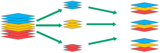 At the beginning of unit, the input of c feature channels were split into two branches with c-c′ and c channels respectively. First, the high efficiency in each building block enabled using more feature channels and larger network capacity. Second, in each block, half of the channel feature (when c′ = c/2 went through the block and joined the next block directly. This can be regarded as a kind of feature reuse. The number of “directly-connected” channels between i-th and (i + j)-th building block was rjc, where r = (1 − c′)/c. In other words, the amount of feature reuse decayed exponentially with the distance between two blocks, and the feature reuse became much weaker between distant blocks. Therefore, it reached the lower bound of the value under the given FLOPs when the number of input characteristic channels and the number of output characteristic channels were equal c1 = c2. Therefore, the three-channel number was adjusted in the program as shown in Figure 7 to better process image features with higher efficiency.