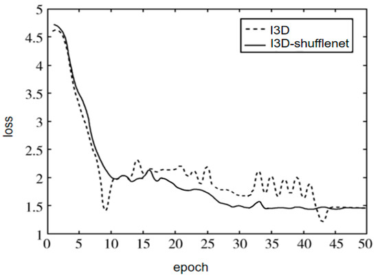 After the prediction of the model, the actual class with the minimum loss value and the probability of this class was the largest. The loss diagram is shown in Figure 8, which shows the improvement of adding channel fusion, the I3D-shufflenet converged faster.
