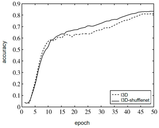 The accuracy of the first 50 iterations of the original I3D and the I3D-shufflenet are shown in Figure 9. It can be seen that the I3D-shufflenet had higher accuracy than the I3D after the 15th iteration.