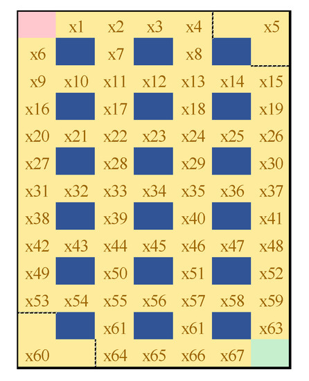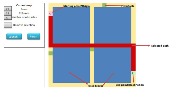 The size of the problem is defined by the number of rows and columns, which are then used to define a transportation area, represented by a rectangle. In Figure 3, an origin is represented by a pink square, and a destination is represented by a light green square. There are two types of obstacles considered in the route-planning problem. Fixed obstacles (or fixed blocks) are represented by blue rectangles, and dynamic obstacles are green squares. The number of dynamic obstacles can be specified, and they are generated at random locations within the transportation area. When the size of the transportation area increases, the complexity of the problem increases significantly, which requires impractical runtimes to determine a solution. For instance, there are three dynamic obstacles in Figure 3. The selected path is represented by a red (thick) line, which connects the starting point and the destination point. The shortest path can be generated on the basis of a shortest-path model or an A-star algorithm to avoid collision with all obstacles (fixed and dynamic) on the grid map. To remove irrelevant data from consideration, a data-encoding process is applied. A transportation area with 21 rows × 21 columns is used in Figure 4 to illustrate the encoding scheme.