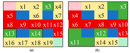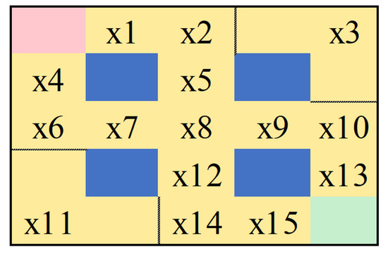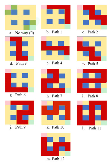 To distinguish between different components within a transportation area, each cell is encoded using the following logic: a cell is encoded with “1” if it represents an origin, a destination, or an obstacle; and encoded with “0” otherwise. Note that fixed obstacles exist permanently and can be omitted from the model. Because a dynamic obstacle located on a line segment blocks the whole segment, an improved encoding scheme is proposed to remove noise from the input data. All cells from a blocked segment are encoded with “1”. Each segment is named as shown in Figure 5. This encoding scheme reduces the combination of input data and greatly reduces the amount of computation required. The output of the ANN is the selected route, which consists of a series of cells from the origin to the destination. The selected route is encoded with a number (e.g., 0, 1, 2) that is used to represent a path identifier (ID). In Figure 4 and Figure 5, the selected path is represented by a red (thick) line that connects the origin to the endpoint. The path is generated using the A-star algorithm to avoid collisions with three obstacles, which exist on segments ×3, ×13, and ×14. However, the obstacles are located in segments at the upper-right corner or lower-left corner. Both entire segments at the corner are blocked the same time, such as ×3, ×4, and ×7 and ×13, ×16, and ×11. Hence, we can group them to become a segment, as shown in Figure 5b. An example of an input dataset is shown as sample 1 in Figure 6, where the selected path was encoded as type 4.