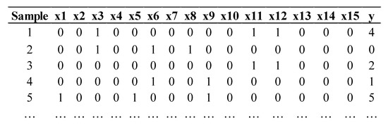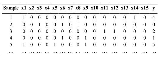 From Table 2, it can be seen that only seven types of paths were significant; the remainder could be considered as outliers and were removed from consideration. The 375 samples were separated into 80% training and 20% testing datasets. An example of encoded input data is shown in Figure 11, where x1 to x15 represent the path segments that have obstacles, and y represents the selected path ID. The structure of the ANN, which is defined by the number of nodes in hidden layers, also affects the accuracy of the ANN model. There are three rules of thumb for determining the number of nodes. The number of hidden nodes should be between the number of input features and the number of target classes, should be equal to the sum of two-thirds of the input features and the size of the output layer, or should be less than double the number of input features. The number of hidden nodes in each experiment should be varied by two or three units. The number of samples for training should be more than 10 times the number of ANN weights [25], which are defined by the equation, numweights = (i +o) × h [26], where i represents the number of input nodes, o is the number of output nodes, and h is the number of nodes in hidden layers.