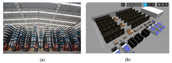 Distribution center 2 (DC2): (a) a very narrow aisle layout at DC2; (b) a simulated environment of an internal layout at DC2.