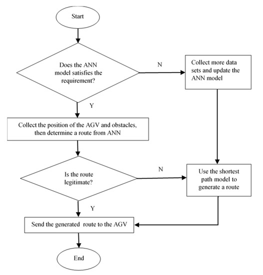 The routes for movement within a DC are initially determined by the shortest-path model and an A-star algorithm. If the solutions from the A-star algorithm have high accuracy when compared with the solutions from the shortest-path model, the A-star algorithm is used due to the shorter runtime and the computing resources required by the automated guided vehicle. Note that an automated guided vehicle is allowed to carry one shipment at a time, due to the standard size of the pallet that can be loaded into a cargo. The input data, which include real-time positions of obstacles, as well as the generated routes, are collected as a training dataset. Once there are sufficient training datasets, an ANN model for a dynamic routing problem is created and used to determine the routing solution. The quality of the solutions from the ANN model needs to be tested with the solutions from the shortest-path model on a regular basis. A requirement is specified according to the accuracy of the ANN model; if the accuracy falls below 95%, the ANN model needs to be updated.