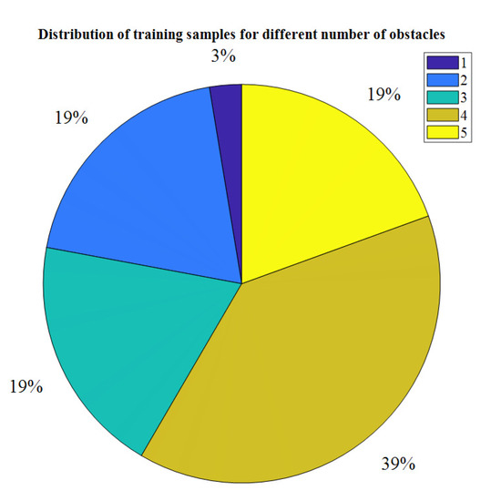 Next, using the data collected from a distribution center (DC), an internal layout with 18 storage racks was created, as shown in Figure 12. There were 67 path segments after combining the segments at the corners. From an observation of an actual operation at the DC, the number of vehicles (folk lifts) working in the DC varies from one to five, with an average of four. Figure 13 shows the distribution of training samples for different numbers of obstacles according to the considered layout. The samples with four obstacles had the highest percentages (39%), while the percentage of samples with two, three, or five obstacles was 19%. The lowest percentage was 3% for samples with one obstacle.