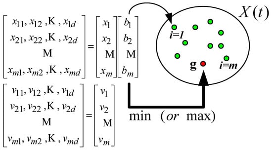 The particle swarm optimization algorithm proposed by Kennedy and Eberhart [] is inspired by the animal swarms social behavior, such as bird flocks and fish schools. The basic notion of the algorithm can be explained using the illustrative example presented in Figure 2.