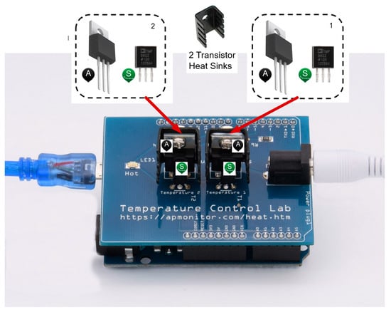 The TCLab is presented from another perspective in Figure 4. As it can be observed, the transistors (TIP31C) are the control system actuators and operate as temperature heaters (Q1 and Q2). Two TMP36 sensors measure the temperature in each transistor casing (T1 and T2). As it can also be observed from Figure 4, the two transistors are connected to heat sinks acting as heat dissipators. The sensors are glued to the transistor casings using a non-conductive epoxy containing a thermochromic paint. This paint changes color when the temperature rises above 37 °C. The TCLab can be programmed using MATLAB®/SIMULINK®, Python and GNU Octave, with a wide range of programs freely available in []. This study uses the MATLAB®/SIMULINK® connection. More information regarding TCLab can also be found in [,,,].