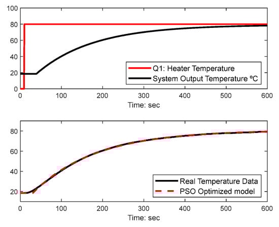 The first issue that must be addressed is to identify a dynamic model relating temperature measured in transistor 1 (T1) with the actuating heater signal (Q1). A FOPTD model was identified based on an open-loop step response using both the classical two-point and PSO optimization methods as proposed in [,]. The following PSO conditions were used in the model identification tests: