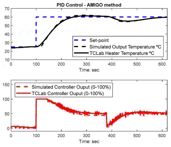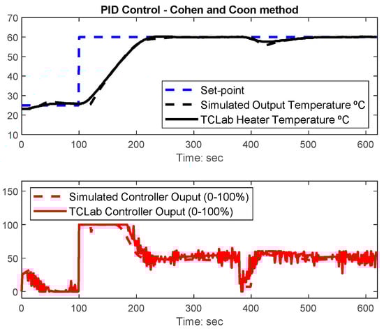 Based on the FOPTD PSO model, PID controllers can be designed using several tuning methods. In [], results were presented using the Cohen-Coon (CC) settings as these perform well for the TCLab. The results obtained with the CC PID settings Kp = 13.47, Ti = 45.99 s, and Td = 7.00 s are presented in Figure 7. This figure presents the overlapped results between the simulated and TCLab responses. A step input is applied to the system reference input at t = 0 s to define the TCLab transistor 1 set-point temperature at 25 °C and another one at t = 100 s increasing the set-point to 60 °C. A load disturbance with a magnitude of −40% is applied to the controller output at t = 380 s. Both the FOPTD model and the CC PID gains are used in the next section for comparison purposes with the other methods.