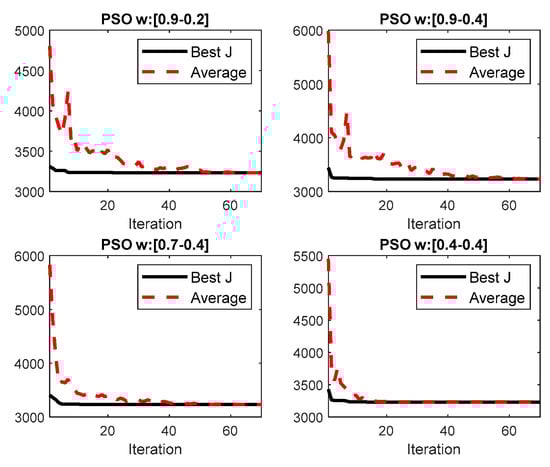 - The inertia weight for initial and final values were ωinit = 0.7 and ωfin = 0.4. These values were deemed appropriate considering the number of iterations used, as it can be observed from Figure 8. In this figure, four different inertia weight intervals [ωinit, ωfin] were considered: (a) [0.9, 0.2], (b) [0.9, 0.4], [0.7, 0.4], and [0.4, 0.4].