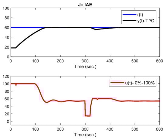 The optimizations consider a step response applied at the reference input at t = 0 s assuming an ambient temperature of 18 °C and a set-point of 60 °C. The simulation time was 600 s, and a load disturbance with amplitude −40% was applied at instant t = 300 s. The optimization test result considering just the minimization of IAE is presented in Figure 9, Figure 10 and Figure 11. In this case, the gains converged to the following values: Kp = 13.83, Ti = 39.54 s, and Td = 7.14 s. Figure 9 presents the SPT and LDR responses in the top plot and the control signal in the lower plot. As it can be observed, the system tracks well with no overshoot and with an acceptable load disturbance rejection.