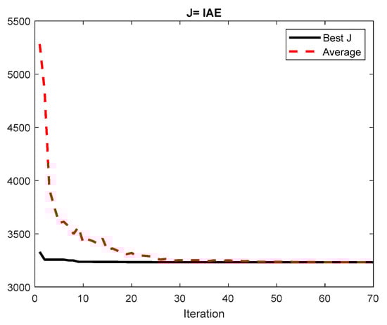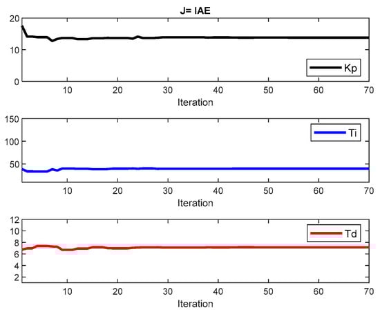Figure 10 shows the best PID gains evolution over 70 iterations. It is possible to observe from Figure 10 that the parameters converged to values are very close to the final ones by iteration 40. Figure 11 presents the evolution obtained with the best swarm cost value, IAE, and the average of the entire swarm particles cost function values. As observed, there is a convergence between the average and the best values in between iterations 40 and 50. These results clearly indicate that 70 iterations are an adequate stopping criterion, in this case.