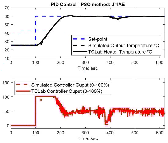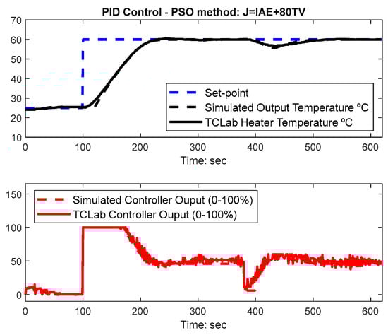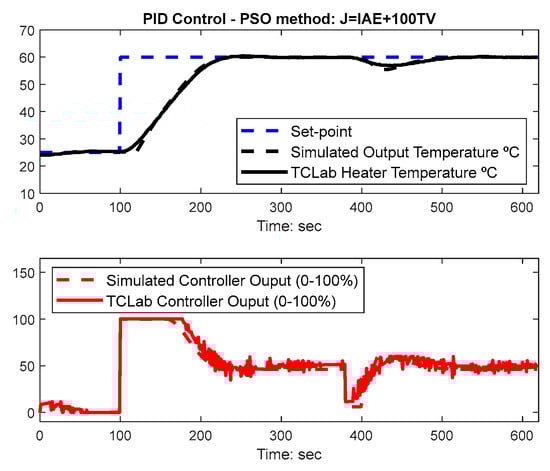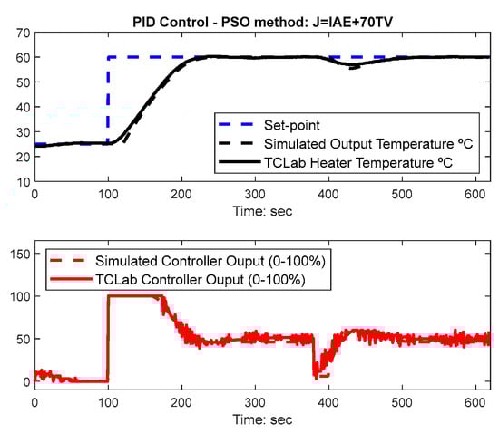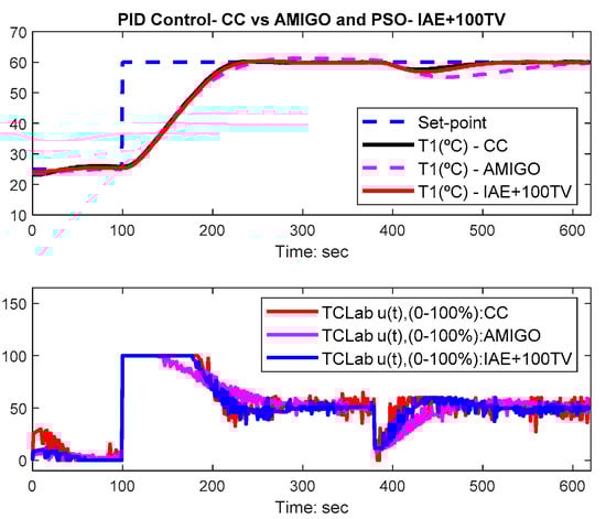This section presents both simulation and TCLab results regarding the PID controller gains optimized with the PSO algorithm as depicted in the previous sections. The results are compared with the Cohen-Coon (CC) settings [], as previously introduced in [,] and a more recent technique: AMIGO [], which is well-known to achieve system robustness. For the sake of experiment replication, these two tuning rule methods for PID controllers are presented in Table 1.