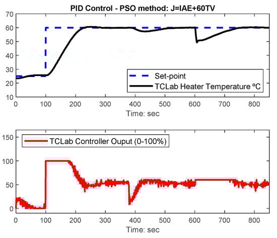 The PSO was applied to identify a first order plus time delay model for the TCLab kit in [,]. In this paper, the PSO design of PID controllers based on an additive compromise cost function involving the Integral Absolute Error (IAE) and Total Variation (TV) is proposed. This technique is validated both with simulation and practical results obtained with the TCLab. The results obtained with the proposed technique are compared with the ones obtained with the GWO algorithm and classical tuning techniques. The novel contributions of this paper are highlighted in the following points: