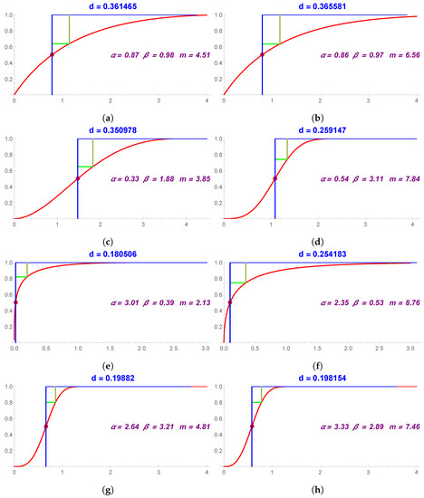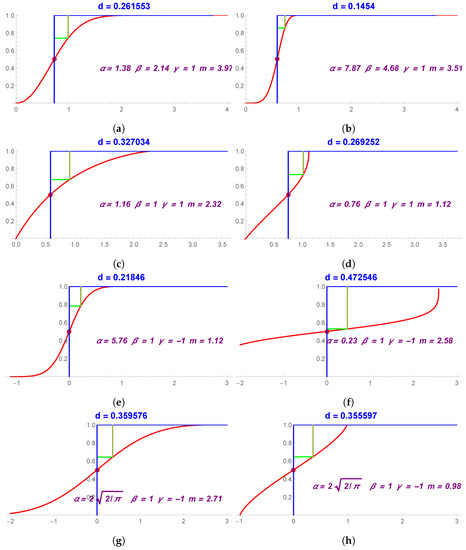 Let us consider some computational examples. The obtained results are presented in Table 2. In these examples for different values of parameters , , , m we calculate the Hausdorff distance between the Heaviside step function and the Pliant probability distribution . Graphical results are presented in Figure 3 and it can be seen that the “saturation” is faster. In the last column of Table 2 we show which classical probability distribution can be considered as a approximation of the Pliant probability distribution function.