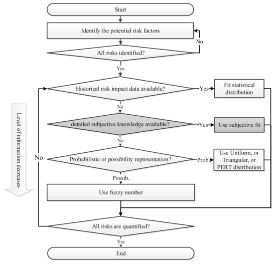 As classified by Biller and Gunes [], the two approaches are categorized based on data availability. The first approach can be adopted when there is sufficient historical data available for a particular variable []. In this case, a probability distribution is fit to the data and is then input into the risk assessment model. The second approach is adopted when there is an absence of data. This approach uses elicitation methods to construct the input distribution [], where the risk analyst can decide to use either (1) a probabilistic approach by choosing either triangular, uniform, or PERT distributions [,], or (2) a possibility approach, where fuzzy numbers are used to represent the impact of a risk factor [].