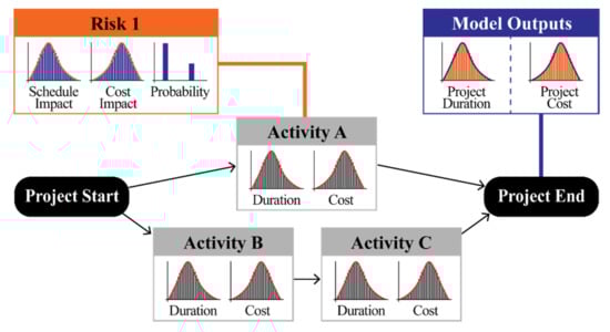 A MCS experiment for assessing project risks is performed as follows. First, the baseline cost and schedule of the individual activities are prepared []. Then, risk factors affecting the project are identified, and the cost impact, schedule impact, probability of occurrence, and affected work-packages are determined for each individual risk factor []. If a risk occurs while running the simulation experiment, the cost and schedule impacts are added to the affected activities. An example project, consisting of three activities (A, B, C) and one risk factor affecting Activity A, is presented in Figure 2.