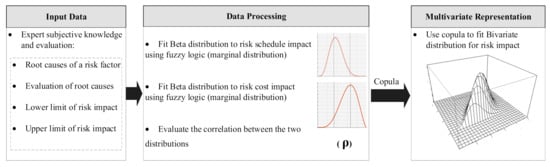 To address these limitations, this paper proposes a methodology that is designed to enhance risk assessment outcomes by (1) assisting risk analysts in fitting appropriate distributions for detailed subjective knowledge of the cost and schedule impacts of risk factors (see dark grey area, Figure 1) and (2) adapting existing methods to model the dependence between the cost and schedule impact of a risk factor in a Monte Carlo simulation (MCS)-based risk assessment model. Fuzzy logic is used to process and quantify subjective knowledge, which is then fit to a probabilistic distribution function that represents the marginal distribution for the impact on either cost or schedule. Then, copula-based modeling of multivariate distributions [] is used to model the dependence between the cost and schedule impact of a risk factor. The remaining sections of this paper are organized as follows: MCS in risk assessment, input modeling for MCS, and correlation and dependence between input distributions are first discussed in a literature review section. Then, the research methodology is explained. Next, an illustrative case study is presented to demonstrate the functionality of the proposed method, and a sensitivity analysis is performed to establish its validity. The final section summarizes conclusions and future research directions.