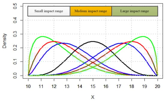 The next step uses expert knowledge to subjectively assess the relationship between the adverse consequence of a root cause and the overall cost or schedule impact of a risk factor. For example, “if the adverse consequence of root 1 is large, then the overall risk impact is medium.” The range of a risk factor impact (i.e., between minimum and maximum) is then calibrated by mapping the range to a predefined scale using the concept of membership values. The mapping values represent the confidence level with which the expert believes that a particular value belongs to the set [] and that the impact will be in a certain range. To facilitate mapping, the risk impact range is divided into three equidistant subsets. Notably, Beta distributions can take multiple shapes, of which three cases, as shown in Figure 5, are of interest for calibration. These are shapes that are (1) skewed to the upper limit, (2) skewed to the lower limit, or (3) symmetric. Cases where the distribution is skewed toward the lower limit are mapped to the small impact range; cases where the distribution is symmetric are mapped to the medium impact range; while cases where the distribution is skewed toward the upper limit are mapped to the large impact range.