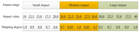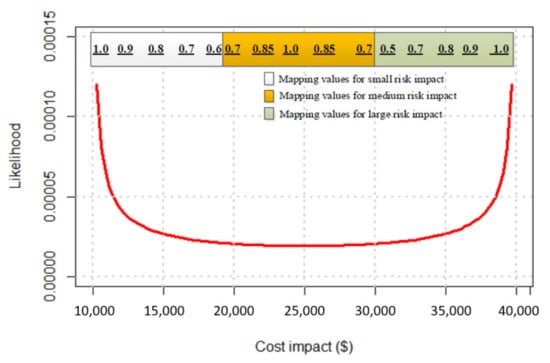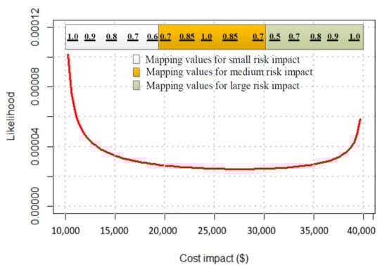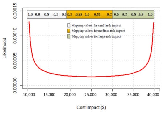 Then, the end points of the cost-risk impact distribution were identified by the analyst as minimum = $ 10,000 and maximum = $ 40,000. The range was divided into three equidistant sections, each with the value of $ 10,000. Then, at the analyst’s discretion, each range impact was divided into five elements. A membership degree for each element in each impact range was assigned by the analyst. The elements in each range along with the membership degrees are provided in Figure 6.