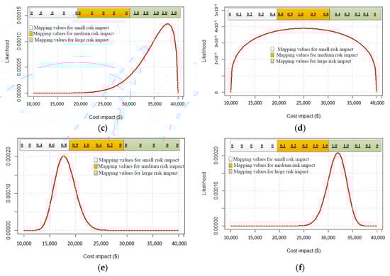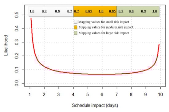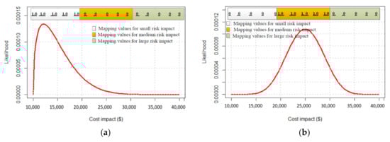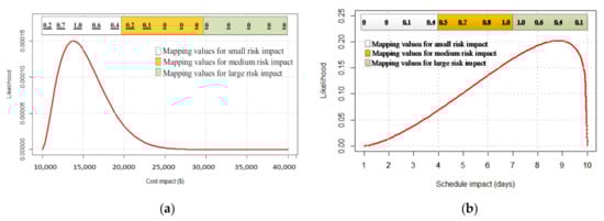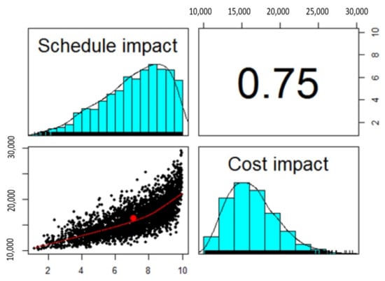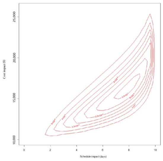 Output of the model is presented in Figure 14. The process is repeated until a probability density function of the joint distribution is derived for each risk factor. These distributions can then be input into any existing MCS-based decision-support systems. Notably, for risk factors that have only schedule or risk impacts, marginal distributions will only be calculated for the cost-risk impact or schedule-risk impact (Figure 12a,b). MCS-based decision-support systems use the distributions to sample a cost-risk impact, schedule-risk impact, or joint cost-schedule risk impact value for each risk factor based on its probability of occurrence. The results of several simulation iterations are then combined to provide a number of project insights, such as (1) the expected project completion date as cumulative distribution, (2) the expected project cost as a cumulative distribution, and (3) time and cost contingencies. Readers are referred to [,,] for more information on the application of MCS-based decision-support systems for risk assessment.