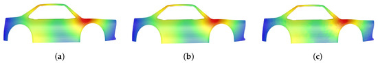 In a second experiment, we simulated a laser Doppler vibrometry setup. We used Blender to model the side frame of a car. The triangular mesh consisted of 2296 vertices. These serve as the locations of the input points. Again, we picked three of those and assigned each one a toy value of , and , respectively. As in the experiment above, we then calculated a dummy value in every other point. In a real world situation, these could be vibration amplitudes as for instance described in [16]. This model is referenced by the name Car. A visualization is given in Figure 5.