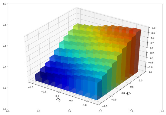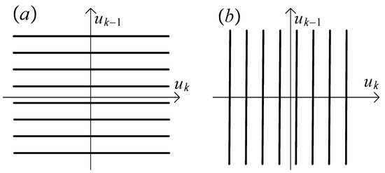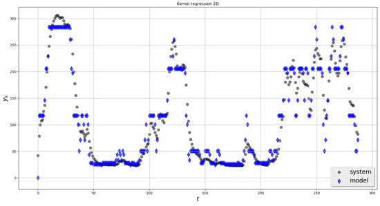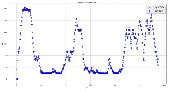 The results are presented in Table 1 and Figure 5 and Figure 6. Explicit derivation of the true finite order (2D or 3D) regression function is problematic, owing to the fact that the neglected part of input signal, i.e., the ‘tail’ connected with terms , is transferred through the non-linear characteristic . Figure 5 and Figure 6 illustrate non-parametric character and non-linear properties of the model, and give a general view on the shape of input–output relationship, which can be helpful for eventual parametrization. Quantized input (59) can be a good choice, when , and the non-parametric estimate plays supporting role for non-linear least squares-based parameter estimation in step 2. Nevertheless, in purely non-parametric approach, i.e., for , the number of possible realizations of increases exponentially. In the considered example, for 9 points in (59), probability of kernel selection for each behaves like and the estimate becomes sensitive on the noise .